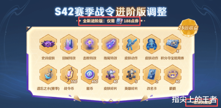 战令取消典藏阶层,进阶战令降价为188点券,其中包含一款史诗皮肤,但祈光池和勇者皮肤也取消了,公正等于改日的战令返场皮肤齐不错通过战令币兑换,哪怕有进阶的要求,蓝本388现时只需要188,条款也平缓了不少。